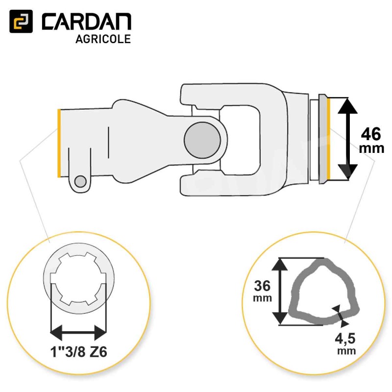 Joint de cardan Benzi complet tube triangle 36x4,5 - 1-3/8 Z6 | JTI05-BENZI Référence JTI05-BENZI Disponible sous 24/48h Caractéristiques Croisillon : 27x74,5 mmSortie : 1-3/8 Z6 à PoussoirTube : Triangulaire intérieur 36x4,5 mm Descriptif produit Joint de cardan standard complet de marque Benzi, comprenant la machoire tube, le croisillon et la machoire outil ou tracteur. Cet ensemble se mont... En savoir plus Fabricant Réserver du stock × Vous souhaitez vous assurer de la disponibilité d’un produit ? Notre service de réservation de stock est fait pour vous ! Dès réception de votre demande, nous vous envoyons un tarif de réservation accompagné d’un devis à régler en ligne. Une fois le paiement validé, le stock vous est attribué et réservé pour votre commande.Livraison possible sous 24h. Ce service est payant et nécessite un compte pro. Si vous n’avez pas encore de compte, vous devrez en créer un pour finaliser votre demande et régler le devis de réservation. Connexion requise Connectez-vous ou créez un compte pour accéder à la réservation de stock Se connecter / Créer un compte Réserver du stock Télécharger les caractéristiques techniques Partagez ce produit Partagez ce produit 101,77 € TTC / pièce 84,81 € HT Comparer - + Ajouter au panier Sauvegarder ce produit dans ma liste Achat rapide Quantité minimale 1Options de livraison Besoin de conseils ? Rappel gratuit Contactez-nous 01 83 64 42 62 Nom / Prénom * Téléphone * Email * Message * Envoyer * Informations obligatoires Demander un devis Demande de devis × Vous devez être connecté pour demander un devis. Je suis un particulier Je suis un proDéja client ? Se connecter Créer mon compte Créer un compte Étape précédente SIRET Entreprise APE Aucune société pour ce siret L'adresse email de comptabilité est différente de l'adresse email de votre compte client ? Oui Non Email de la comptabilité : Civilité M. Mme Prénom * Nom* Email * Mot de passe * (Cinq caractères minimum) Date de naissance -1 2 3 4 5 6 7 8 9 10 11 12 13 14 15 16 17 18 19 20 21 22 23 24 25 26 27 28 29 30 31 -January February March April May June July August September October November December -2026 2025 2024 2023 2022 2021 2020 2019 2018 2017 2016 2015 2014 2013 2012 2011 2010 2009 2008 2007 2006 2005 2004 2003 2002 2001 2000 1999 1998 1997 1996 1995 1994 1993 1992 1991 1990 1989 1988 1987 1986 1985 1984 1983 1982 1981 1980 1979 1978 1977 1976 1975 1974 1973 1972 1971 1970 1969 1968 1967 1966 1965 1964 1963 1962 1961 1960 1959 1958 1957 1956 1955 1954 1953 1952 1951 1950 1949 1948 1947 1946 1945 1944 1943 1942 1941 1940 1939 1938 1937 1936 1935 1934 1933 1932 1931 1930 1929 1928 1927 1926 1925 1924 1923 1922 1921 1920 1919 1918 1917 1916 1915 1914 1913 1912 1911 1910 1909 1908 1907 1906 1905 1904 1903 1902 1901 1900 Inscrivez-vous à notre newsletter ! Recevez les offres spéciales de nos partenaires ! S'inscrire *Champ obligatoire Vous souhaitez obtenir un devis personnalisé pour ce produit ? Complétez le formulaire ci-dessous et nous vous recontacterons rapidement avec une offre adaptée à vos besoins.Devis gratuit et sans engagement. Quantité souhaitée * Message ou spécifications Envoyer ma demande de devis * Informations obligatoires Description Joint de cardan standard complet de marque Benzi, comprenant la machoire tube, le croisillon et la machoire outil ou tracteur. Cet ensemble se monte sur un tube triangle (trilobes) intérieur qui a une dimension de 36x4,5 mm. Son croisillon fait 27x74,5 mm et sa sortie est en 1-3/8 6 cannelures verrouillage avec un poussoir. La gorge qui permet de recevoir la bague du protecteur a quant à elle un diamètre en mm de 46. Fiche technique Sortie1"3/8 Z6Dimension de tube36x4,5Croisillon27x74,5Profil de tubeTriangulaire intérieurMarqueBENZIRéférence d'origine1G4050007Diamètre de gorge46Type de joint de cardanStandardVerrouillagePoussoir
