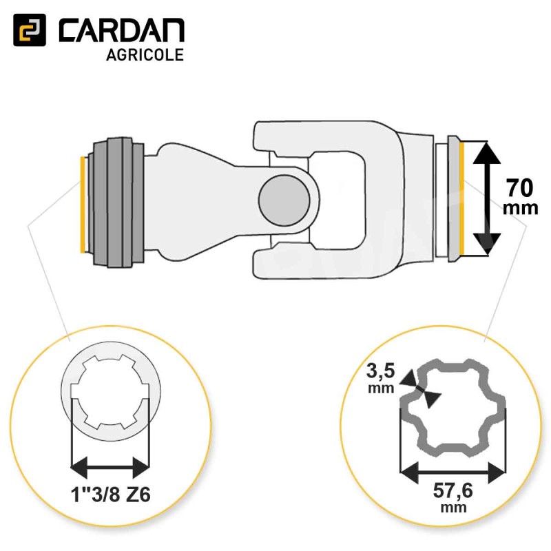 Joint de cardan Comer complet tube multilobes 57,6x3,5 - 1-3/8 Z6 | JME06-COMER Référence JME06-COMER Disponible sous 48/72h Caractéristiques Croisillon : 30,2x80 mmSortie : 1-3/8 Z6 à billesTube : Multilobes extérieur 57,6x3,5 mm Descriptif produit Joint de cardan standard complet de marque Comer, comprenant la machoire tube, le croisillon et la machoire outil ou tracteur. Cet ensemble se mont... En savoir plus Fabricant Réserver du stock × Vous souhaitez vous assurer de la disponibilité d’un produit ? Notre service de réservation de stock est fait pour vous ! Dès réception de votre demande, nous vous envoyons un tarif de réservation accompagné d’un devis à régler en ligne. Une fois le paiement validé, le stock vous est attribué et réservé pour votre commande.Livraison possible sous 24h. Ce service est payant et nécessite un compte pro. Si vous n’avez pas encore de compte, vous devrez en créer un pour finaliser votre demande et régler le devis de réservation. Connexion requise Connectez-vous ou créez un compte pour accéder à la réservation de stock Se connecter / Créer un compte Réserver du stock Télécharger les caractéristiques techniques Partagez ce produit Partagez ce produit 223,05 € TTC / pièce 185,87 € HT Comparer - + Ajouter au panier Sauvegarder ce produit dans ma liste Achat rapide Quantité minimale 1Options de livraison Besoin de conseils ? Rappel gratuit Contactez-nous 01 83 64 42 62 Nom / Prénom * Téléphone * Email * Message * Envoyer * Informations obligatoires Demander un devis Demande de devis × Vous devez être connecté pour demander un devis. Je suis un particulier Je suis un proDéja client ? Se connecter Créer mon compte Créer un compte Étape précédente SIRET Entreprise APE Aucune société pour ce siret L'adresse email de comptabilité est différente de l'adresse email de votre compte client ? Oui Non Email de la comptabilité : Civilité M. Mme Prénom * Nom* Email * Mot de passe * (Cinq caractères minimum) Date de naissance -1 2 3 4 5 6 7 8 9 10 11 12 13 14 15 16 17 18 19 20 21 22 23 24 25 26 27 28 29 30 31 -January February March April May June July August September October November December -2026 2025 2024 2023 2022 2021 2020 2019 2018 2017 2016 2015 2014 2013 2012 2011 2010 2009 2008 2007 2006 2005 2004 2003 2002 2001 2000 1999 1998 1997 1996 1995 1994 1993 1992 1991 1990 1989 1988 1987 1986 1985 1984 1983 1982 1981 1980 1979 1978 1977 1976 1975 1974 1973 1972 1971 1970 1969 1968 1967 1966 1965 1964 1963 1962 1961 1960 1959 1958 1957 1956 1955 1954 1953 1952 1951 1950 1949 1948 1947 1946 1945 1944 1943 1942 1941 1940 1939 1938 1937 1936 1935 1934 1933 1932 1931 1930 1929 1928 1927 1926 1925 1924 1923 1922 1921 1920 1919 1918 1917 1916 1915 1914 1913 1912 1911 1910 1909 1908 1907 1906 1905 1904 1903 1902 1901 1900 Inscrivez-vous à notre newsletter ! Recevez les offres spéciales de nos partenaires ! S'inscrire *Champ obligatoire Vous souhaitez obtenir un devis personnalisé pour ce produit ? Complétez le formulaire ci-dessous et nous vous recontacterons rapidement avec une offre adaptée à vos besoins.Devis gratuit et sans engagement. Quantité souhaitée * Message ou spécifications Envoyer ma demande de devis * Informations obligatoires Description Joint de cardan standard complet de marque Comer, comprenant la machoire tube, le croisillon et la machoire outil ou tracteur. Cet ensemble se monte sur un tube multilobes extérieur qui a une dimension de 57,6x3,5 mm. Son croisillon fait 30,2x80 mm et sa sortie est en 1-3/8 6 cannelures verrouillage à billes dont la bague est en plastique. La gorge qui permet de recevoir la bague du protecteur a quant à elle un diamètre en mm de 70. Fiche technique Sortie1"3/8 Z6Dimension de tube57,6x3,5Croisillon30,2x80Profil de tubeMultilobes extérieurMarqueCOMERRéférence d'origine121.025.656.00Diamètre de gorge70Type de joint de cardanStandardVerrouillageA billes