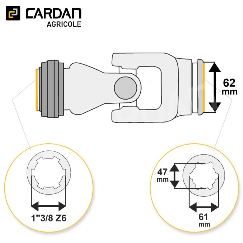 Joint de cardan Magdalena complet tube étoile 61x47 - 1-3/8 Z6 | JEE19VB-MAGDALENA Référence JEE19VB-MAGDALENA Disponible sous 2/3 semaines Caractéristiques Croisillon : 32x76 mmSortie : 1-3/8 Z6 à billesTube : Etoile extérieur 61x47 mm Descriptif produit Joint de cardan standard complet de marque Magdalena, comprenant la machoire tube, le croisillon et la machoire outil ou tracteur. Cet ensemble se ... En savoir plus Fabricant Réserver du stock × Vous souhaitez vous assurer de la disponibilité d’un produit ? Notre service de réservation de stock est fait pour vous ! Dès réception de votre demande, nous vous envoyons un tarif de réservation accompagné d’un devis à régler en ligne. Une fois le paiement validé, le stock vous est attribué et réservé pour votre commande.Livraison possible sous 24h. Ce service est payant et nécessite un compte pro. Si vous n’avez pas encore de compte, vous devrez en créer un pour finaliser votre demande et régler le devis de réservation. Connexion requise Connectez-vous ou créez un compte pour accéder à la réservation de stock Se connecter / Créer un compte Réserver du stock Télécharger les caractéristiques techniques Partagez ce produit Partagez ce produit 160,38 € TTC / pièce 133,65 € HT Comparer - + Ajouter au panier Sauvegarder ce produit dans ma liste Achat rapide Quantité minimale 1Options de livraison Besoin de conseils ? Rappel gratuit Contactez-nous 01 83 64 42 62 Nom / Prénom * Téléphone * Email * Message * Envoyer * Informations obligatoires Demander un devis Demande de devis × Vous devez être connecté pour demander un devis. Je suis un particulier Je suis un proDéja client ? Se connecter Créer mon compte Créer un compte Étape précédente SIRET Entreprise APE Aucune société pour ce siret L'adresse email de comptabilité est différente de l'adresse email de votre compte client ? Oui Non Email de la comptabilité : Civilité M. Mme Prénom * Nom* Email * Mot de passe * (Cinq caractères minimum) Date de naissance -1 2 3 4 5 6 7 8 9 10 11 12 13 14 15 16 17 18 19 20 21 22 23 24 25 26 27 28 29 30 31 -January February March April May June July August September October November December -2026 2025 2024 2023 2022 2021 2020 2019 2018 2017 2016 2015 2014 2013 2012 2011 2010 2009 2008 2007 2006 2005 2004 2003 2002 2001 2000 1999 1998 1997 1996 1995 1994 1993 1992 1991 1990 1989 1988 1987 1986 1985 1984 1983 1982 1981 1980 1979 1978 1977 1976 1975 1974 1973 1972 1971 1970 1969 1968 1967 1966 1965 1964 1963 1962 1961 1960 1959 1958 1957 1956 1955 1954 1953 1952 1951 1950 1949 1948 1947 1946 1945 1944 1943 1942 1941 1940 1939 1938 1937 1936 1935 1934 1933 1932 1931 1930 1929 1928 1927 1926 1925 1924 1923 1922 1921 1920 1919 1918 1917 1916 1915 1914 1913 1912 1911 1910 1909 1908 1907 1906 1905 1904 1903 1902 1901 1900 Inscrivez-vous à notre newsletter ! Recevez les offres spéciales de nos partenaires ! S'inscrire *Champ obligatoire Vous souhaitez obtenir un devis personnalisé pour ce produit ? Complétez le formulaire ci-dessous et nous vous recontacterons rapidement avec une offre adaptée à vos besoins.Devis gratuit et sans engagement. Quantité souhaitée * Message ou spécifications Envoyer ma demande de devis * Informations obligatoires Description Joint de cardan standard complet de marque Magdalena, comprenant la machoire tube, le croisillon et la machoire outil ou tracteur. Cet ensemble se monte sur un tube étoile extérieur qui a une dimension de 61x47 mm. Son croisillon fait 32x76 mm et sa sortie est en 1-3/8 6 cannelures verrouillage à billes dont la bague est en plastique. La gorge qui permet de recevoir la bague du protecteur a quant à elle un diamètre en mm de 62. Fiche technique Sortie1"3/8 Z6Dimension de tube61x47Croisillon32x76Profil de tubeEtoile extérieurMarqueMAGDALENARéférence d'origineJS2400S5Diamètre de gorge62Type de joint de cardanStandardVerrouillageA billes