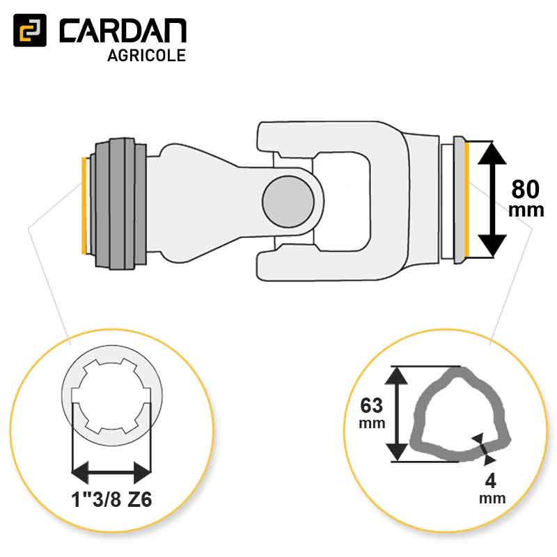Joint de cardan standard complet de marque Benzi, comprenant la machoire tube, le croisillon et la machoire outil ou tracteur. Cet ensemble se monte sur un tube triangle (trilobes) extérieur qui a une dimension de 63x4 mm. Son croisillon fait 35x106,5 mm et sa sortie est en 1-3/8 6 cannelures verrouillage à billes dont la bague est en plastique. La gorge qui permet de recevoir la bague du protecteur a quant à elle un diamètre en mm de 80.
