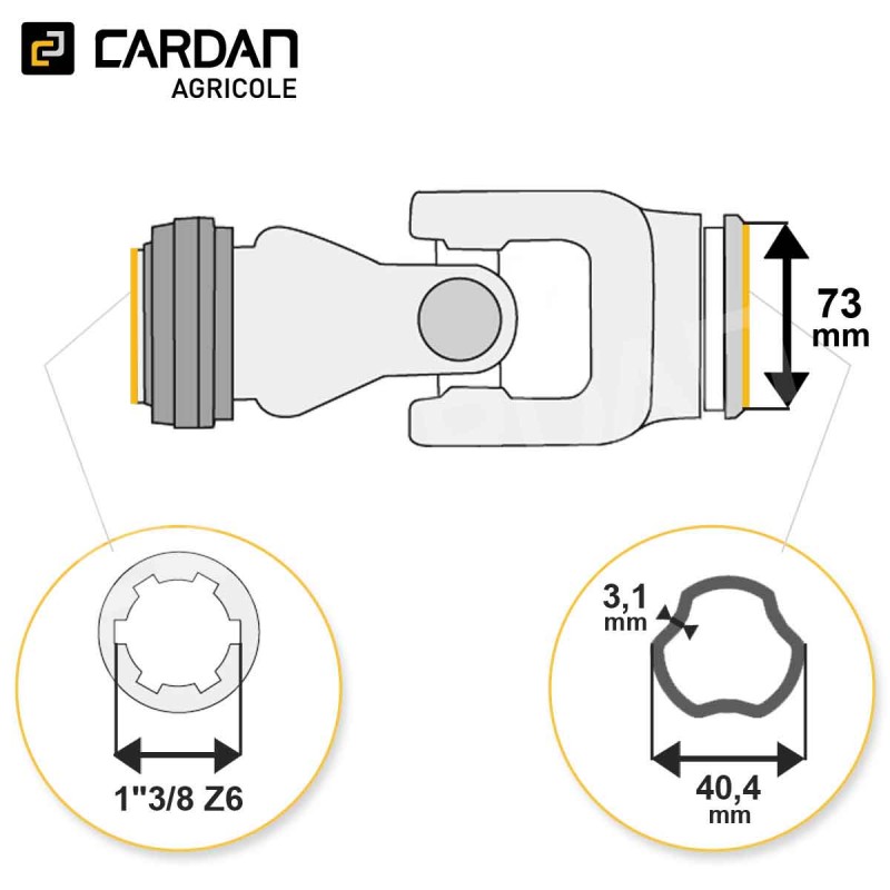 Joint de cardan Bondioli complet tube free rotation 40,4x3,1 - 1-3/8 Z6 | JFRESFTS2-BONDIOLI Référence JFRESFTS2-BONDIOLI Disponible sous 2/3 semaines Caractéristiques Croisillon : 23,8x61,3 mmSortie : 1-3/8 Z6 à billesTube : Free rotation extérieur 40,4x3,1 mm Descriptif produit Joint de cardan standard complet de marque Bondioli, comprenant la machoire tube, le croisillon et la machoire outil ou tracteur. Cet ensemble se m... En savoir plus Fabricant Réserver du stock × Vous souhaitez vous assurer de la disponibilité d’un produit ? Notre service de réservation de stock est fait pour vous ! Dès réception de votre demande, nous vous envoyons un tarif de réservation accompagné d’un devis à régler en ligne. Une fois le paiement validé, le stock vous est attribué et réservé pour votre commande.Livraison possible sous 24h. Ce service est payant et nécessite un compte pro. Si vous n’avez pas encore de compte, vous devrez en créer un pour finaliser votre demande et régler le devis de réservation. Connexion requise Connectez-vous ou créez un compte pour accéder à la réservation de stock Se connecter / Créer un compte Réserver du stock Télécharger les caractéristiques techniques Partagez ce produit Partagez ce produit 191,51 € TTC / pièce 159,59 € HT Comparer - + Ajouter au panier Sauvegarder ce produit dans ma liste Achat rapide Quantité minimale 1Options de livraison Besoin de conseils ? Rappel gratuit Contactez-nous 01 83 64 42 62 Nom / Prénom * Téléphone * Email * Message * Envoyer * Informations obligatoires Demander un devis Demande de devis × Vous devez être connecté pour demander un devis. Je suis un particulier Je suis un proDéja client ? Se connecter Créer mon compte Créer un compte Étape précédente SIRET Entreprise APE Aucune société pour ce siret L'adresse email de comptabilité est différente de l'adresse email de votre compte client ? Oui Non Email de la comptabilité : Civilité M. Mme Prénom * Nom* Email * Mot de passe * (Cinq caractères minimum) Date de naissance -1 2 3 4 5 6 7 8 9 10 11 12 13 14 15 16 17 18 19 20 21 22 23 24 25 26 27 28 29 30 31 -January February March April May June July August September October November December -2026 2025 2024 2023 2022 2021 2020 2019 2018 2017 2016 2015 2014 2013 2012 2011 2010 2009 2008 2007 2006 2005 2004 2003 2002 2001 2000 1999 1998 1997 1996 1995 1994 1993 1992 1991 1990 1989 1988 1987 1986 1985 1984 1983 1982 1981 1980 1979 1978 1977 1976 1975 1974 1973 1972 1971 1970 1969 1968 1967 1966 1965 1964 1963 1962 1961 1960 1959 1958 1957 1956 1955 1954 1953 1952 1951 1950 1949 1948 1947 1946 1945 1944 1943 1942 1941 1940 1939 1938 1937 1936 1935 1934 1933 1932 1931 1930 1929 1928 1927 1926 1925 1924 1923 1922 1921 1920 1919 1918 1917 1916 1915 1914 1913 1912 1911 1910 1909 1908 1907 1906 1905 1904 1903 1902 1901 1900 Inscrivez-vous à notre newsletter ! Recevez les offres spéciales de nos partenaires ! S'inscrire *Champ obligatoire Vous souhaitez obtenir un devis personnalisé pour ce produit ? Complétez le formulaire ci-dessous et nous vous recontacterons rapidement avec une offre adaptée à vos besoins.Devis gratuit et sans engagement. Quantité souhaitée * Message ou spécifications Envoyer ma demande de devis * Informations obligatoires Description Joint de cardan standard complet de marque Bondioli, comprenant la machoire tube, le croisillon et la machoire outil ou tracteur. Cet ensemble se monte sur un tube free rotation extérieur qui a une dimension de 40,4x3,1 mm. Son croisillon fait 23,8x61,3 mm et sa sortie est en 1-3/8 6 cannelures verrouillage à billes dont la bague est en plastique. La gorge qui permet de recevoir la bague du protecteur a quant à elle un diamètre en mm de 73. Fiche technique Sortie1"3/8 Z6Dimension de tube40,4x3,1Croisillon23,8x61,3Profil de tubeFree rotation extérieurMarqueBONDIOLIRéférence d'origineCS2GC083007Diamètre de gorge73Type de joint de cardanStandardVerrouillageA billes