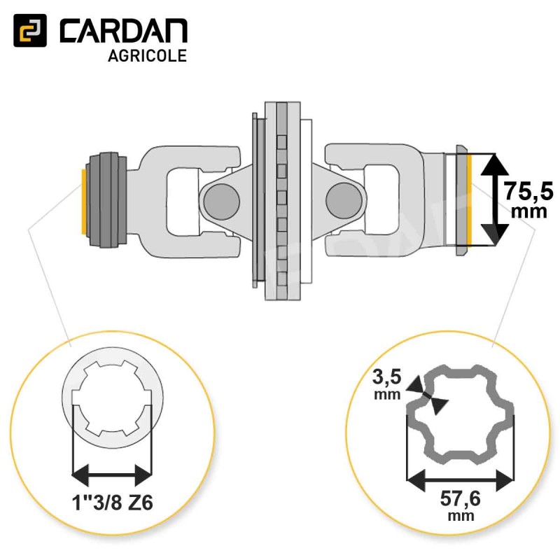 Joint de cardan grand angle Comer complet tube multilobes 57,6x3,5 - 1-3/8 Z6 | HJME60-COMER Référence HJME60-COMER Disponible sous 48/72h Caractéristiques Croisillon : 30,2x95,4 - 30,2x101,4 mmSortie : 1-3/8 Z6 à billesTube : Multilobes extérieur 57,6x3,5 mm Descriptif produit Joint de cardan grand angle 80° complet de marque Comer, comprenant la machoire tube, le croisillon et la machoire outil ou tracteur. Cet ensemble ... En savoir plus Fabricant Réserver du stock × Vous souhaitez vous assurer de la disponibilité d’un produit ? Notre service de réservation de stock est fait pour vous ! Dès réception de votre demande, nous vous envoyons un tarif de réservation accompagné d’un devis à régler en ligne. Une fois le paiement validé, le stock vous est attribué et réservé pour votre commande.Livraison possible sous 24h. Ce service est payant et nécessite un compte pro. Si vous n’avez pas encore de compte, vous devrez en créer un pour finaliser votre demande et régler le devis de réservation. Connexion requise Connectez-vous ou créez un compte pour accéder à la réservation de stock Se connecter / Créer un compte Réserver du stock Télécharger les caractéristiques techniques Partagez ce produit Partagez ce produit 618,41 € TTC / pièce 515,34 € HT Comparer - + Ajouter au panier Sauvegarder ce produit dans ma liste Achat rapide Quantité minimale 1Options de livraison Besoin de conseils ? Rappel gratuit Contactez-nous 01 83 64 42 62 Nom / Prénom * Téléphone * Email * Message * Envoyer * Informations obligatoires Demander un devis Demande de devis × Vous devez être connecté pour demander un devis. Je suis un particulier Je suis un proDéja client ? Se connecter Créer mon compte Créer un compte Étape précédente SIRET Entreprise APE Aucune société pour ce siret L'adresse email de comptabilité est différente de l'adresse email de votre compte client ? Oui Non Email de la comptabilité : Civilité M. Mme Prénom * Nom* Email * Mot de passe * (Cinq caractères minimum) Date de naissance -1 2 3 4 5 6 7 8 9 10 11 12 13 14 15 16 17 18 19 20 21 22 23 24 25 26 27 28 29 30 31 -January February March April May June July August September October November December -2026 2025 2024 2023 2022 2021 2020 2019 2018 2017 2016 2015 2014 2013 2012 2011 2010 2009 2008 2007 2006 2005 2004 2003 2002 2001 2000 1999 1998 1997 1996 1995 1994 1993 1992 1991 1990 1989 1988 1987 1986 1985 1984 1983 1982 1981 1980 1979 1978 1977 1976 1975 1974 1973 1972 1971 1970 1969 1968 1967 1966 1965 1964 1963 1962 1961 1960 1959 1958 1957 1956 1955 1954 1953 1952 1951 1950 1949 1948 1947 1946 1945 1944 1943 1942 1941 1940 1939 1938 1937 1936 1935 1934 1933 1932 1931 1930 1929 1928 1927 1926 1925 1924 1923 1922 1921 1920 1919 1918 1917 1916 1915 1914 1913 1912 1911 1910 1909 1908 1907 1906 1905 1904 1903 1902 1901 1900 Inscrivez-vous à notre newsletter ! Recevez les offres spéciales de nos partenaires ! S'inscrire *Champ obligatoire Vous souhaitez obtenir un devis personnalisé pour ce produit ? Complétez le formulaire ci-dessous et nous vous recontacterons rapidement avec une offre adaptée à vos besoins.Devis gratuit et sans engagement. Quantité souhaitée * Message ou spécifications Envoyer ma demande de devis * Informations obligatoires Description Joint de cardan grand angle 80° complet de marque Comer, comprenant la machoire tube, le croisillon et la machoire outil ou tracteur. Cet ensemble se monte sur un tube multilobes extérieur qui a une dimension de 57,6x3,5 mm. Son croisillon fait 30,2x95,4 - 30,2x101,4 mm et sa sortie est en 1-3/8 6 cannelures verrouillage à billes dont la bague est en plastique. La gorge qui permet de recevoir la bague du protecteur a quant à elle un diamètre en mm de 75,5. Fiche technique Sortie1"3/8 Z6Dimension de tube57,6x3,5Croisillon30,2x95,4 - 30,2x101,4Profil de tubeMultilobes extérieurMarqueCOMERRéférence d'origine121.026.930.00Diamètre de gorge75,5Type de joint de cardanHomocinétiqueVerrouillageA billes