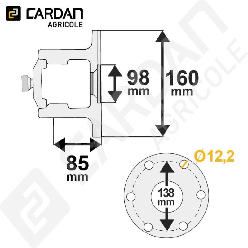 Machoire plateau Walterscheid 36.19.310M / 1136988. Elle se monte sur un croisillon dont les dimensions sont 36X89 - 32X106/110 mm. Elle a un diamètre extérieur de 160 mm, un centreur Femelle de 98 mm. Il possède également 6 trous qui ont un entraxe de fixation de 138 mm.
