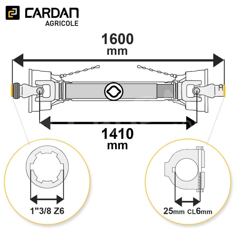 Transmission agricole standard sans sécurité de longueur fermée 1600 mm. Elle est conçue pour supporter une puissance de 16 cv à 540tr/min et 24 cv à 1000 tr/min. La sortie côté tracteur est en 1-3/8 Z6 verrouillage à billes et la sortie côté outil 25 mm verrouillage à boulon tangeant avec clavette de 6 mm. Elle a un tube de type citron.